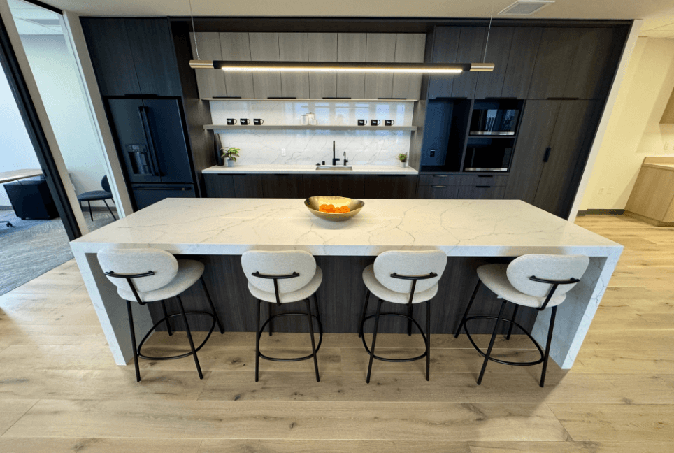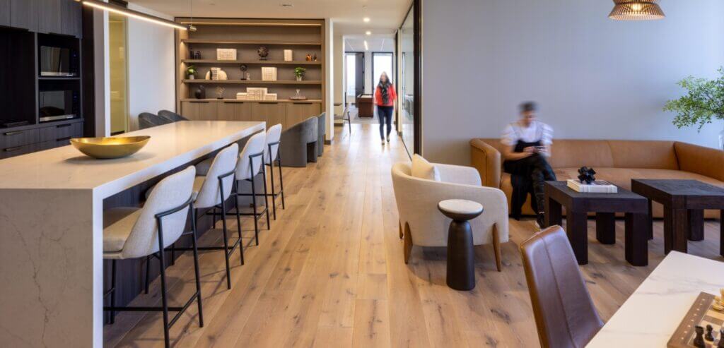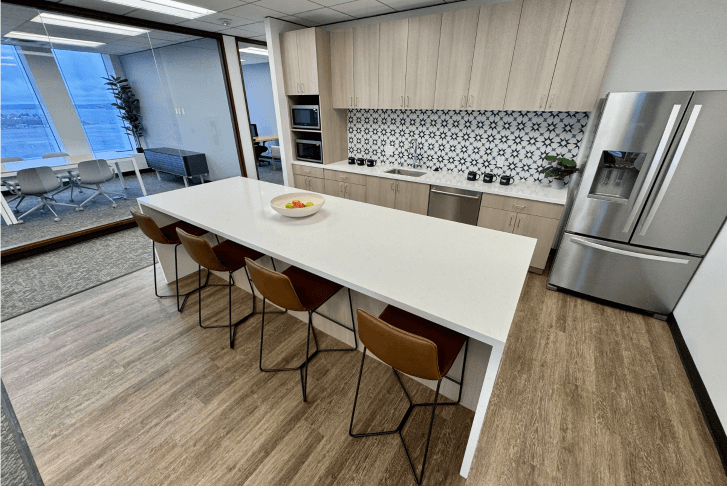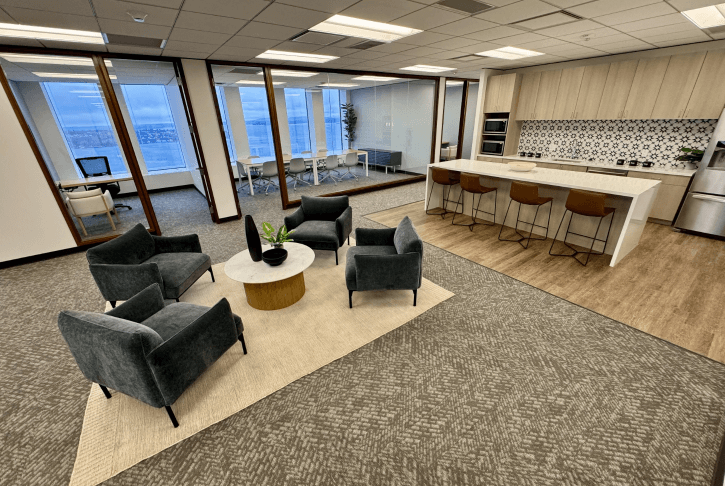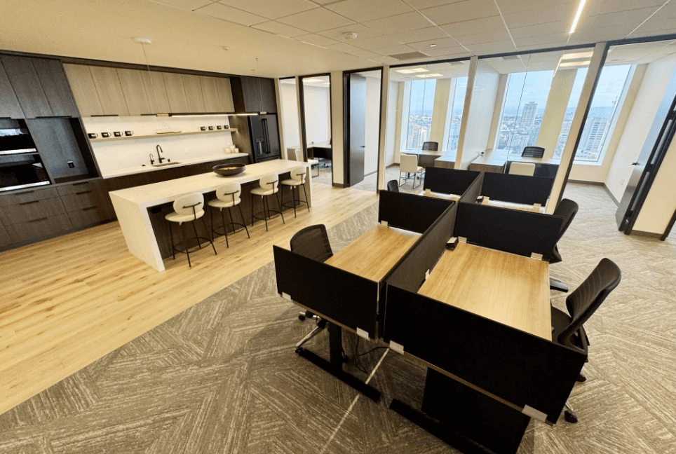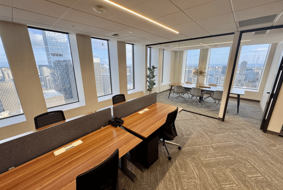 The 42nd floor features four exquisite, ready-to-use pre-built suites, enhanced by a welcoming elevator lobby that immediately exudes sophistication. Each suite showcases an elegant wood wall, beautifully paired with integrated lighting that fosters a warm and inviting ambiance. The meeting rooms are designed with acoustic felt panels, ensuring optimal sound quality during discussions and presentations. A thoughtful blend of open areas and private perimeter offices accommodates various work styles, promoting both collaboration and focus. Luxury details are evident throughout, including stunning hardwood floors, chic stone backsplashes, and custom cabinetry in the break rooms, all complemented by cozy booth seating that offers delightful views of downtown. This harmonious mix of aesthetics and functionality positions these suites as the ideal environment for any modern business.