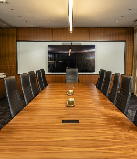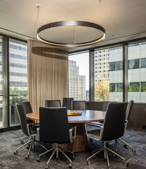 The building features multiple conference rooms with different layouts and functionality to serve a variety of client needs. Each conference facility offers a sleek, professional space for meetings, presentations, and events with a full suite of available AV infrastructure and the ability to accommodate up to 120 people comfortably.